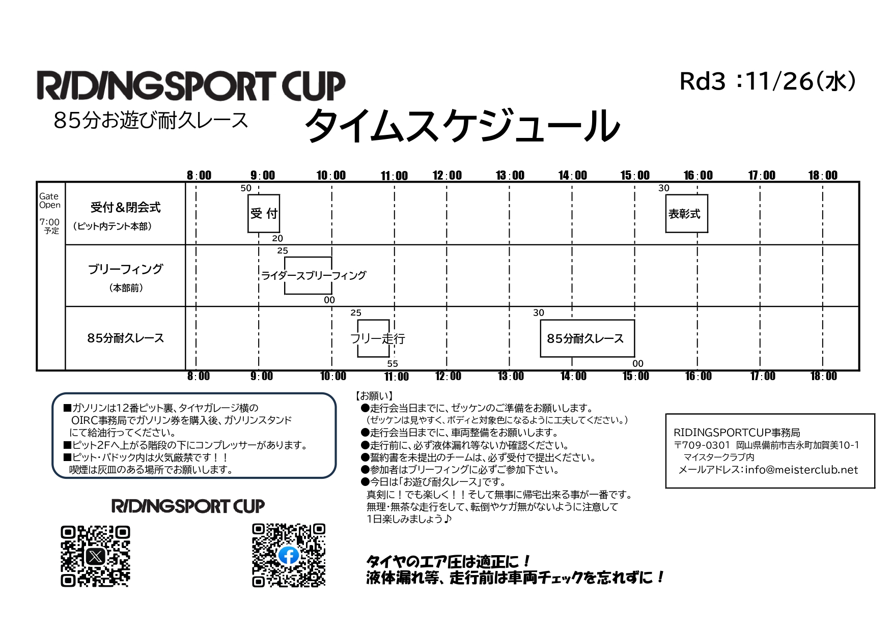 11/26(水)ライディングスポーツカップ 85分お遊び耐久レースRd3参加申込受付中!